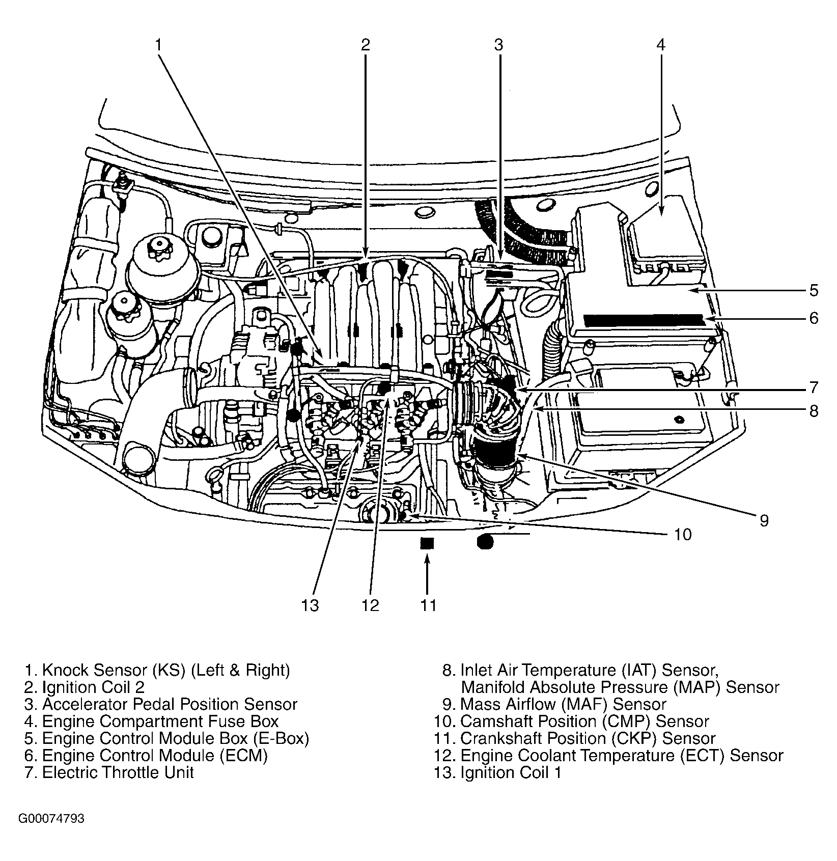 | Engine Control Module (ECM) | Inside engine control module box. See Figure . |