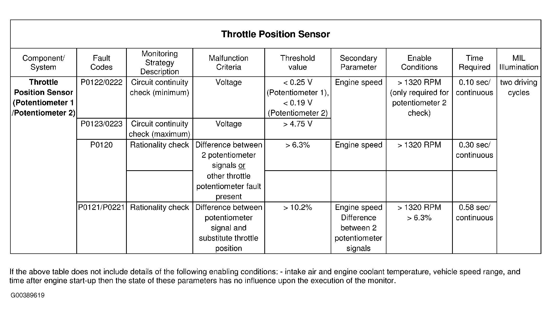 - The engine speed is greater than 1320 RPM, the difference between the 2 potentiometer signals is greater than 6.3% and the difference between the potentiometer signal and substitute throttle position is greater than 10.2%.