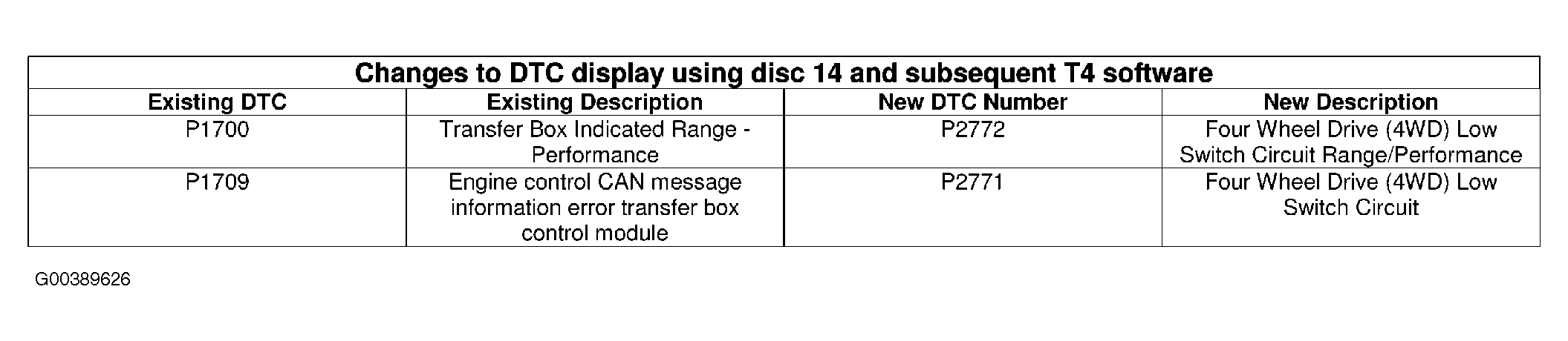 To provide compatibility with later 2005 model year DTCs, from disc 14 of the Range Rover TestBook/T4 diagnostic software, the DTCs in the following table will be displayed with new DTC numbers and descriptions. See Fig 1