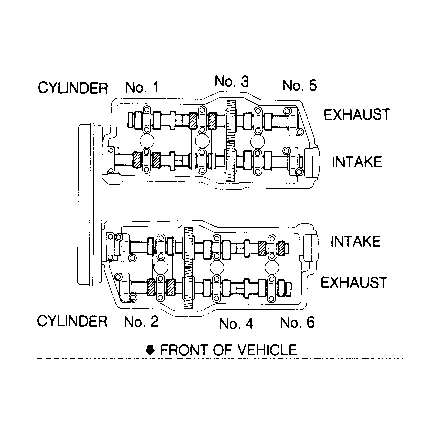 - Measure and record clearance of intake valves on cylinders No. 1 and 6, and exhaust valves on cylinders No. 2 and 3. See Fig 1. Rotate crankshaft pulley 240 degrees (2/3 of a revolution). Measure and record clearance of intake valves on cylinders No. 2 and 3, and exhaust valves on cylinders No. 4 and 5.