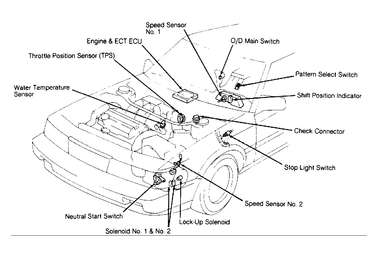 - If no transmission trouble codes are present, the light will blink continuously 2 times per second. Trouble code flashes will be at the rate of one flash per second with longer pauses separating digits and codes. Refer to ES250 AUTOMATIC TRANSMISSION CODE IDENTIFICATION table. Refer to appropriate transmission diagnostic chart. For location of transmission components, see Fig 1.