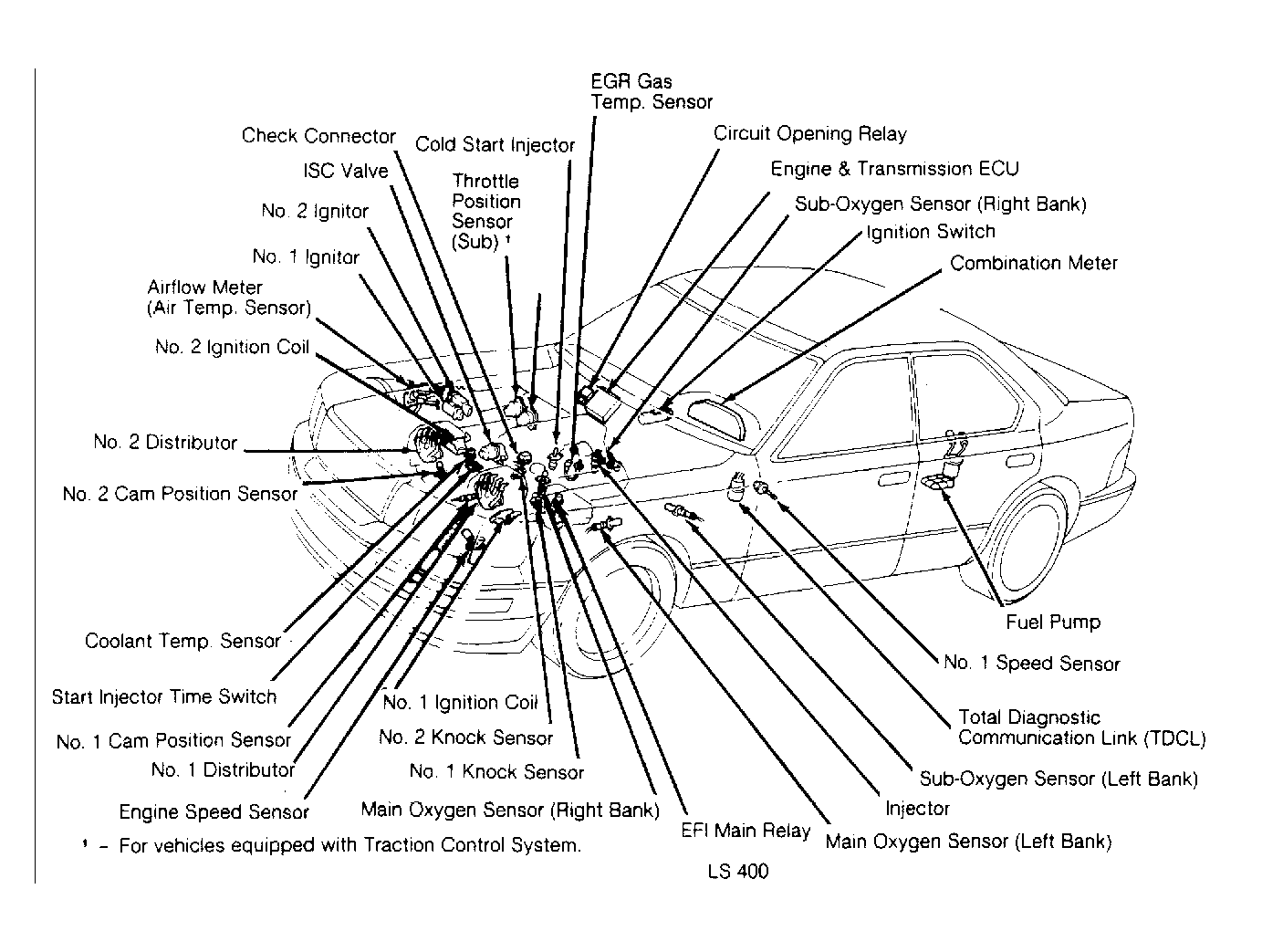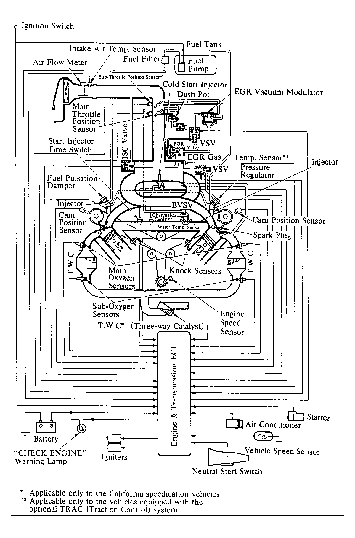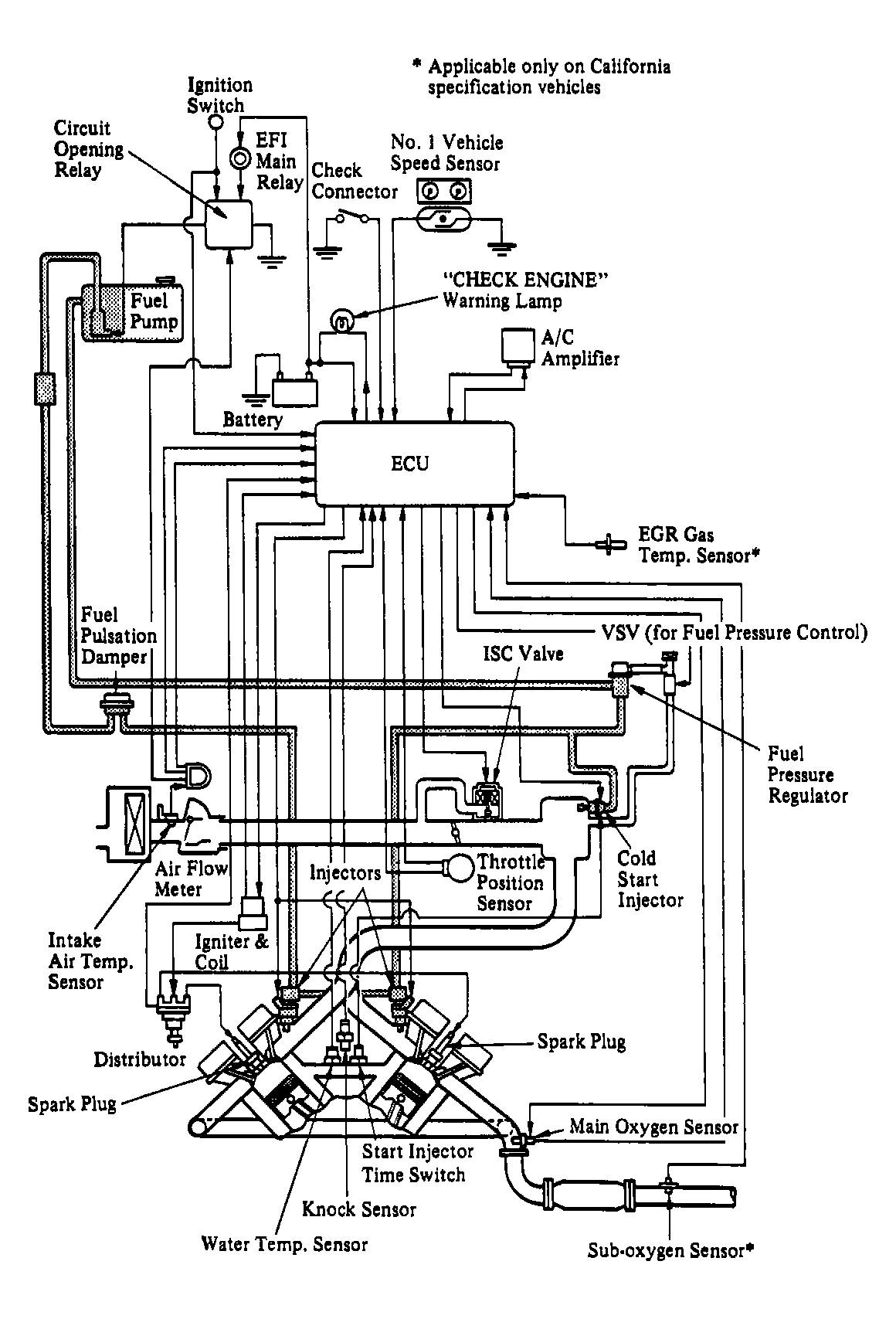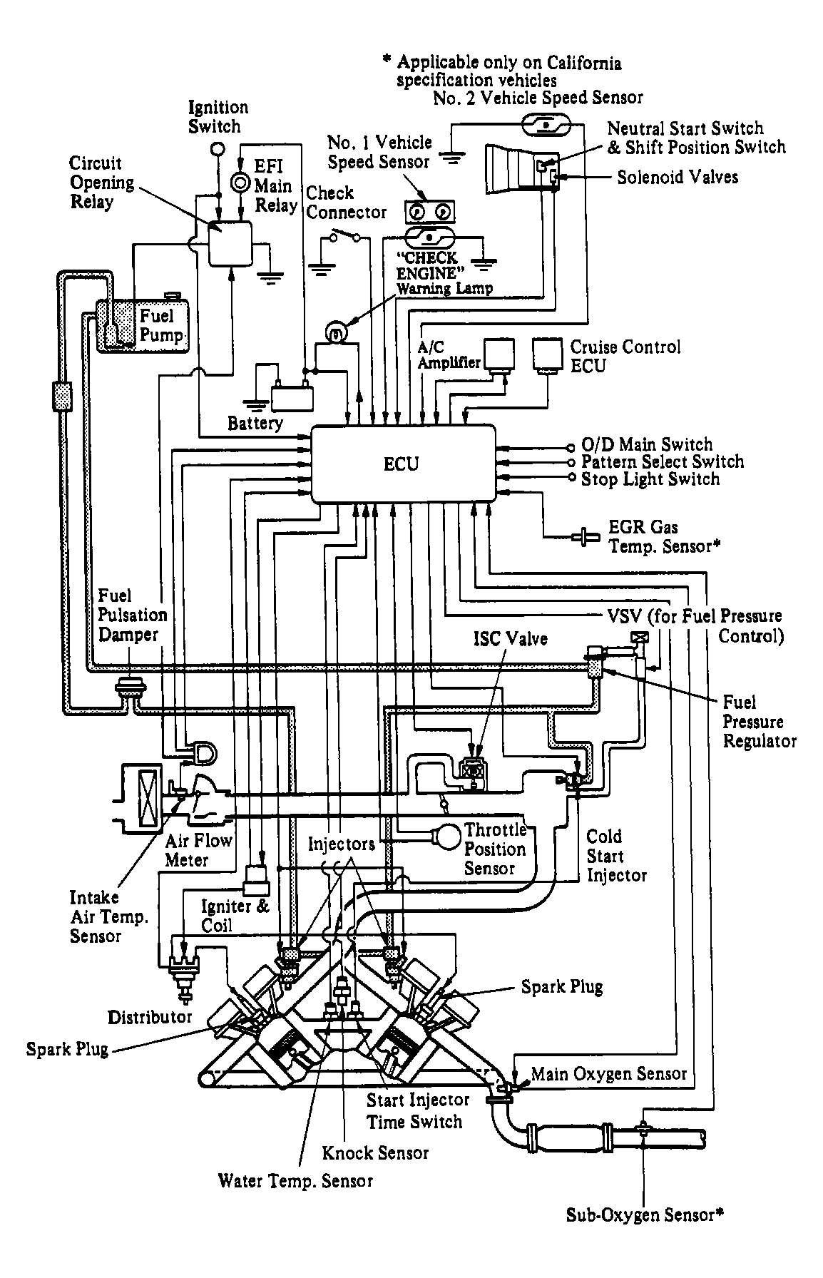 The engine control system uses an Electronic Control Unit (ECU) with a built-in microprocessor. Programs for calculation of fuel injection duration, ignition timing and idle speed are stored inside the ECU and are matched with various engine condition data relayed by input sensors. See Figure or Figure. The ECU uses these data signals from various sensors in the vehicle and makes calculations with stored programs to determine fuel injection duration, ignition timing and idle speed, and outputs control signals to respective actuators that control engine operation.