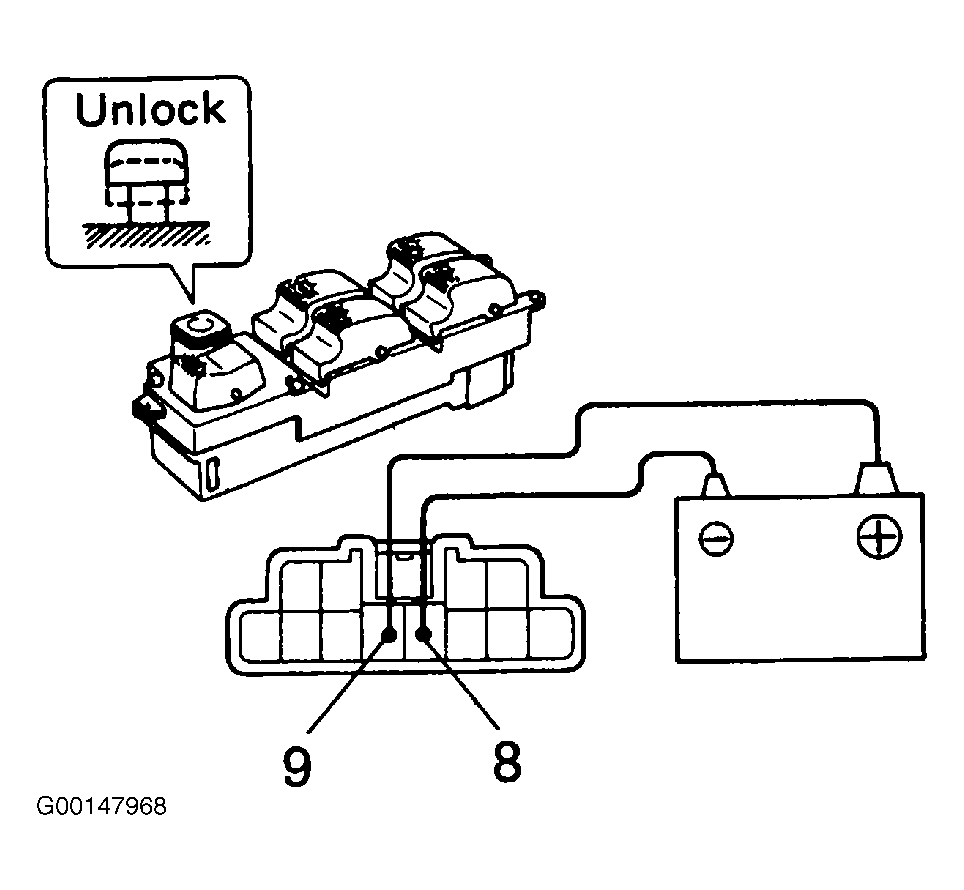 - Set the window lock switch to the lock position, see Fig 2. Check that all the passenger's power window switch illuminations go out. If operation is not as specified, replace the master switch. See POWER WINDOW MASTER SWITCH .