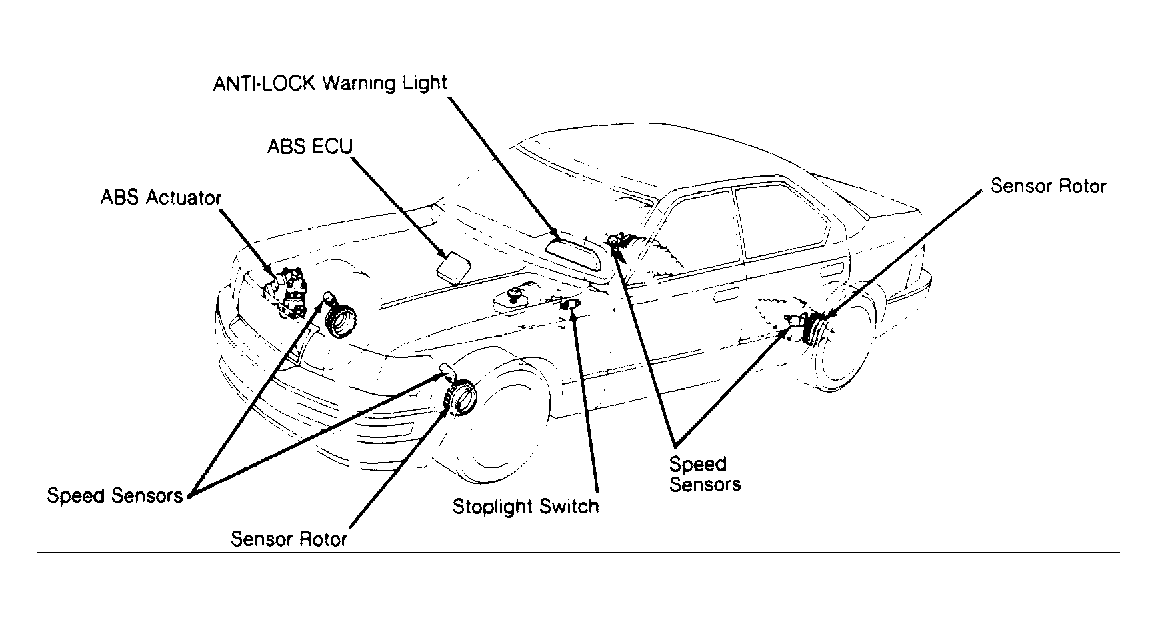 The Anti-Lock Brake System (ABS) is designed to stop vehicle in the shortest distance possible while preventing wheel skid and maintaining vehicle control. The ABS is composed of 4 wheel speed sensors, sensor rotors, ANTI-LOCK warning light, ABS Electronic Control Unit (ECU) and ABS actuator. See Fig 1.