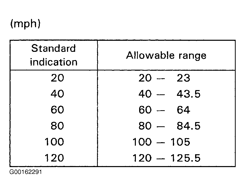 Using a speedometer tester, inspect the speedometer for allowable indication error and check the operation of the odometer. See Fig 1. If error is excessive, replace the combination meter.