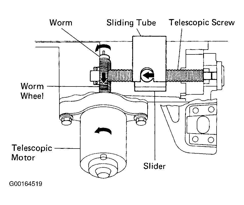 The control gear assembly is composed of the worm wheel, telescopic screw and slider. See Fig 2. Rotation of the telescopic motor moves the slider in the direction of the telescopic screw axis. The sliding tube is integrated with the slider and is moved forward and backward by movement of the slider. See Fig 3.