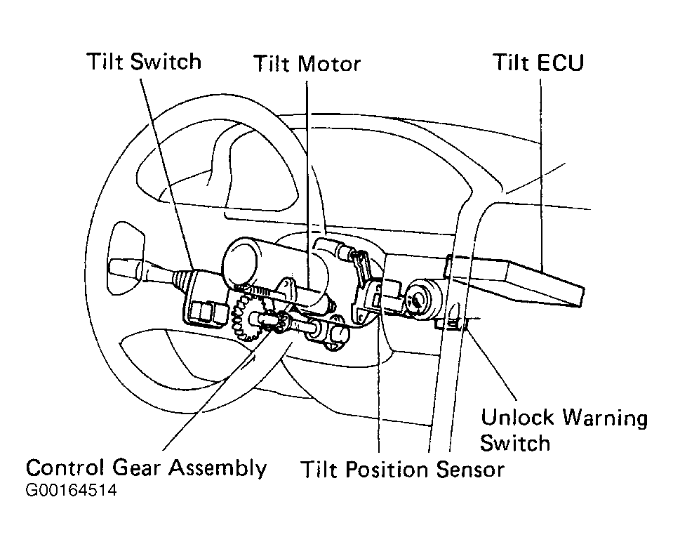 The power tilt mechanism consists of the control gear assembly, tilt motor, tilt position sensor, tilt switch, unlock warning switch and tilt ECU. See Fig 1.