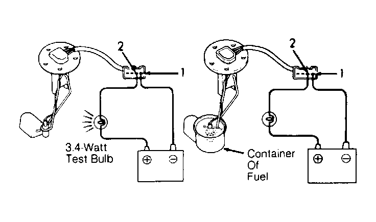 - Remove fuel gauge sending unit. See FUEL GAUGE SENDING UNIT under REMOVAL & INSTALLATION. Apply a 12-volt power source, through a 3.4-watt test bulb, to terminal No. 2. See Fig 1. Connect terminal No. 1 to ground.