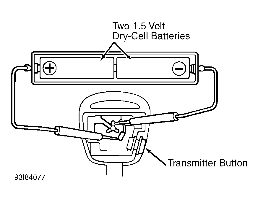 1. Remove screw from ignition key. Remove cover, "O" ring and battery. Connect 2 new 1.5 volt dry-cell batteries in series. Connect positive battery lead to transmitter battery receptacle side terminal. Connect negative battery lead to the transmitter bottom terminal. See Fig 1.