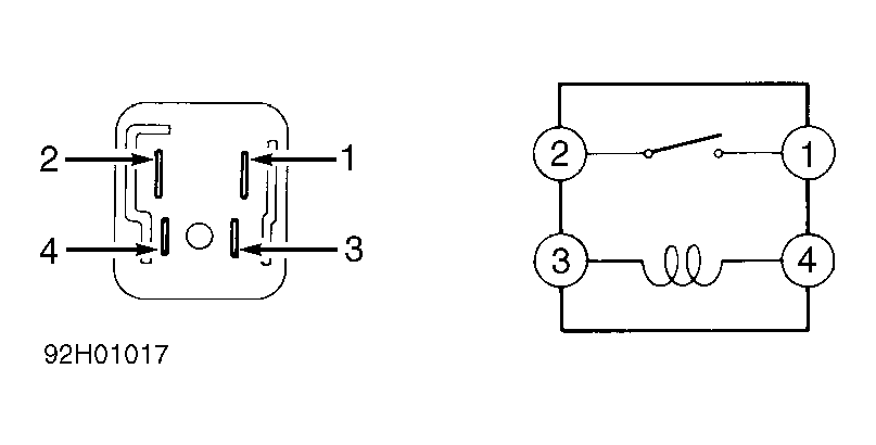 Using an ohmmeter, check for continuity between terminals No. 3 and 4. See Fig 1. If continuity does not exist, replace relay. If continuity exists, connect battery voltage to terminals No. 3 and 4, and check for continuity between terminals No. 1 and 2. If continuity exists, relay is okay. If continuity does not exist, replace relay.