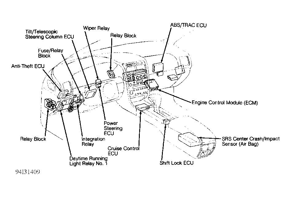 | ABS | Behind right side of dash, integral of TRAC ECU. See Figure. | |
