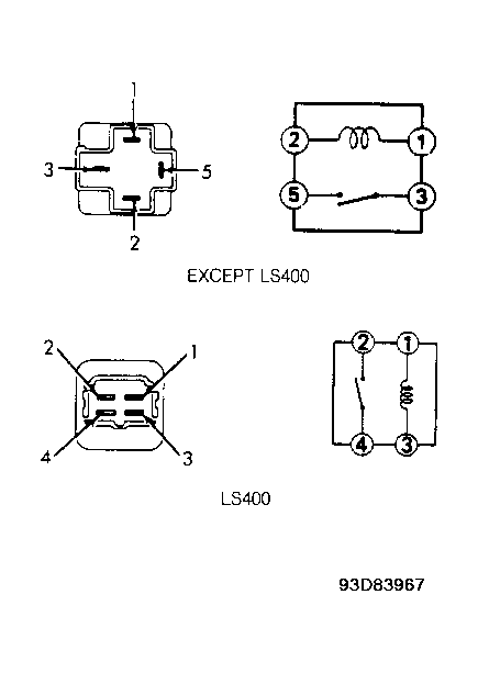Remove power window relay from underhood fuse/relay box. Using a DVOM, check for continuity between terminals No. 1 and 2. Check for no continuity between terminals No. 3 and 5. See Fig 1. Using jumper wires, connect terminals No. 1 and 2 to battery voltage and ground. If continuity does not exist between terminals No. 3 and 5, replace relay.