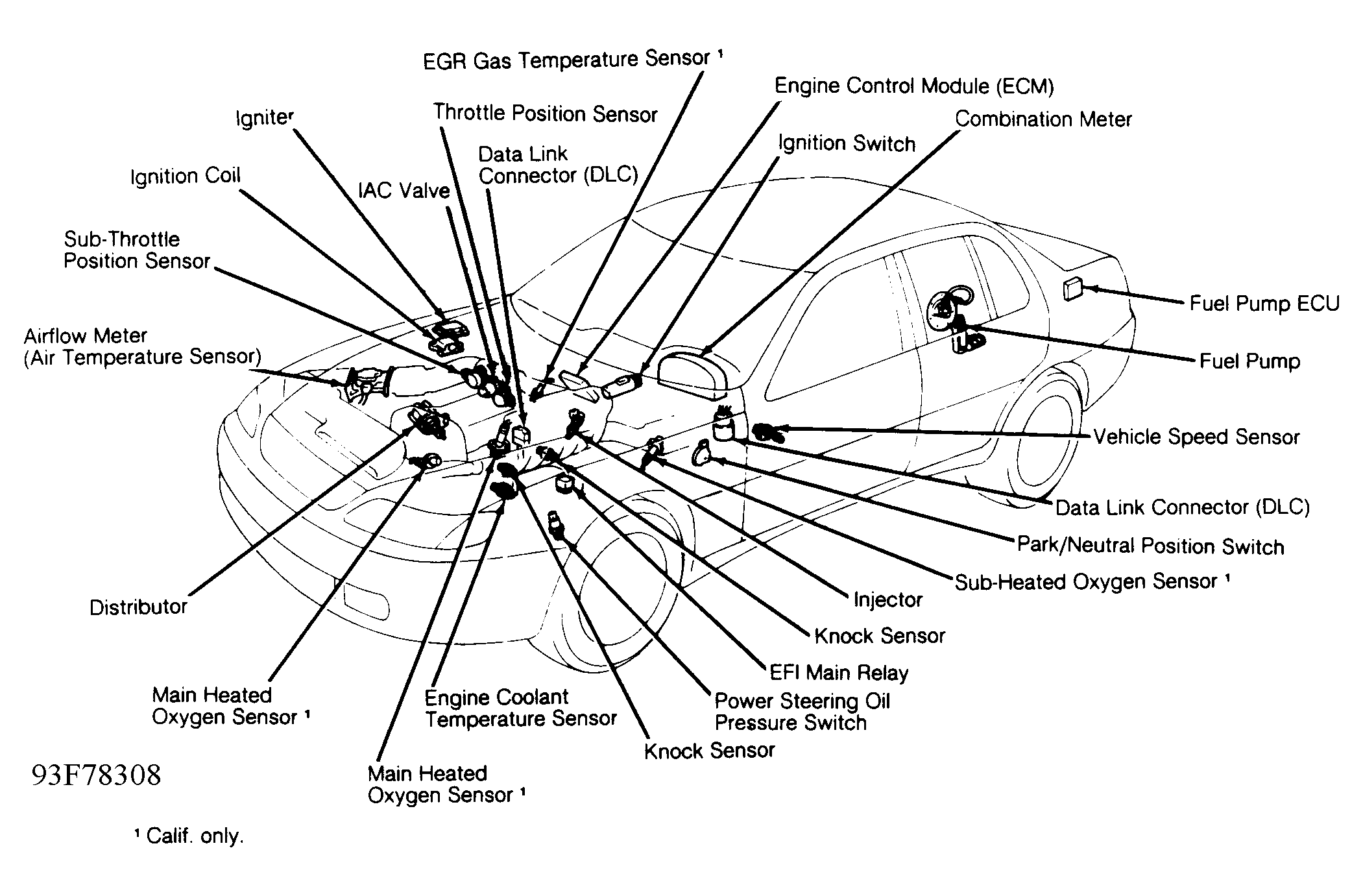 Engine control system uses an Electronic Control Module (ECM), also known as Electronic Control Unit (ECU). Programs for calculation of fuel injection duration, ignition timing and idle speed are stored inside the ECM and are matched with various engine condition data relayed by input sensors. See Fig 1-4. The ECM uses these data signals from various sensors in the vehicle and makes calculations with stored programs to determine fuel injection duration, ignition timing and idle speed, and outputs control signals to respective actuators that control engine operation.