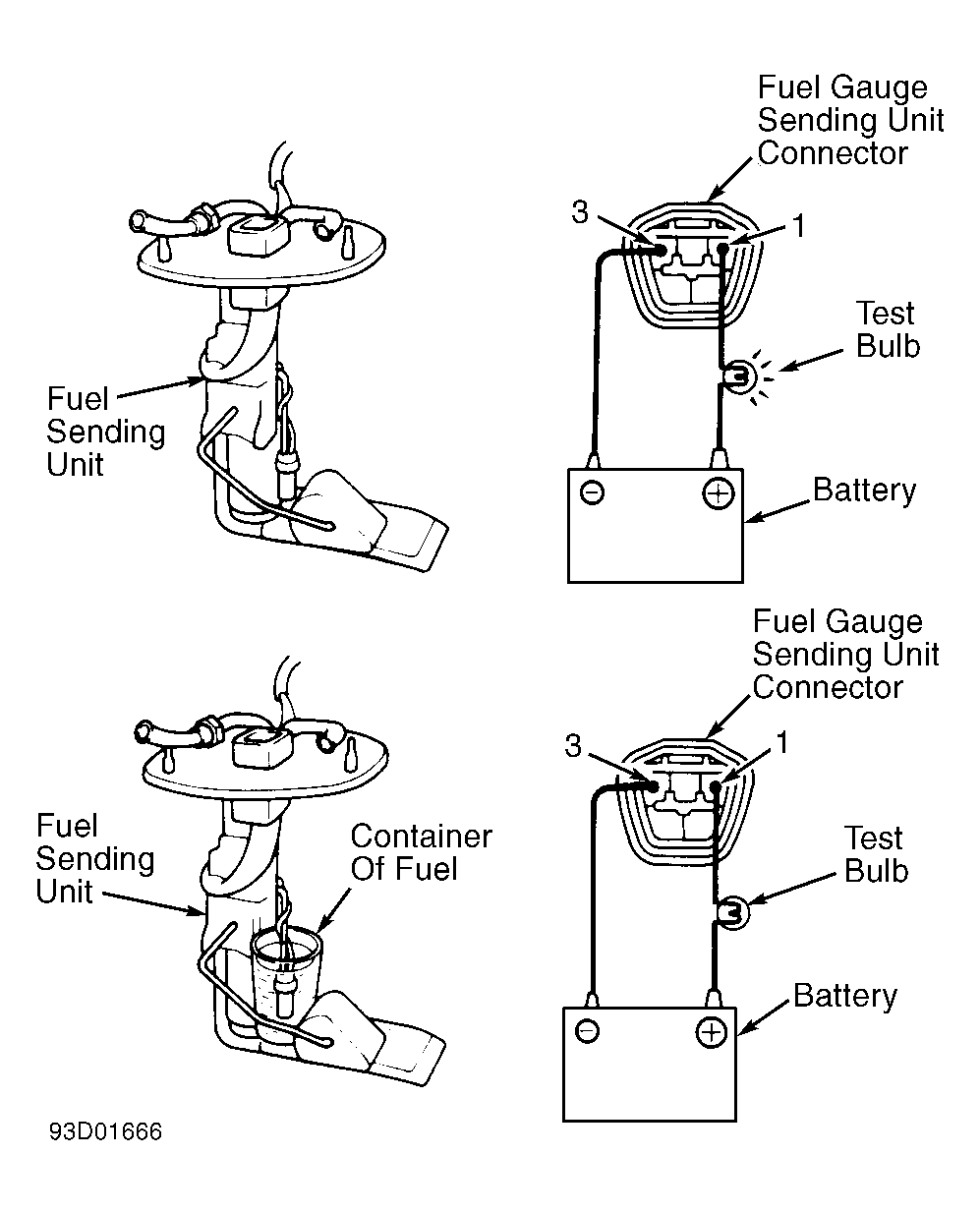 - Connect a 3.4-watt test light between battery positive terminal and sending unit connector. Test light should come on after a few moments. Submerge entire sending unit (or fuel level sensor portion) in a container of fuel. Test light should go out. If operation is not as specified, replace sending unit.