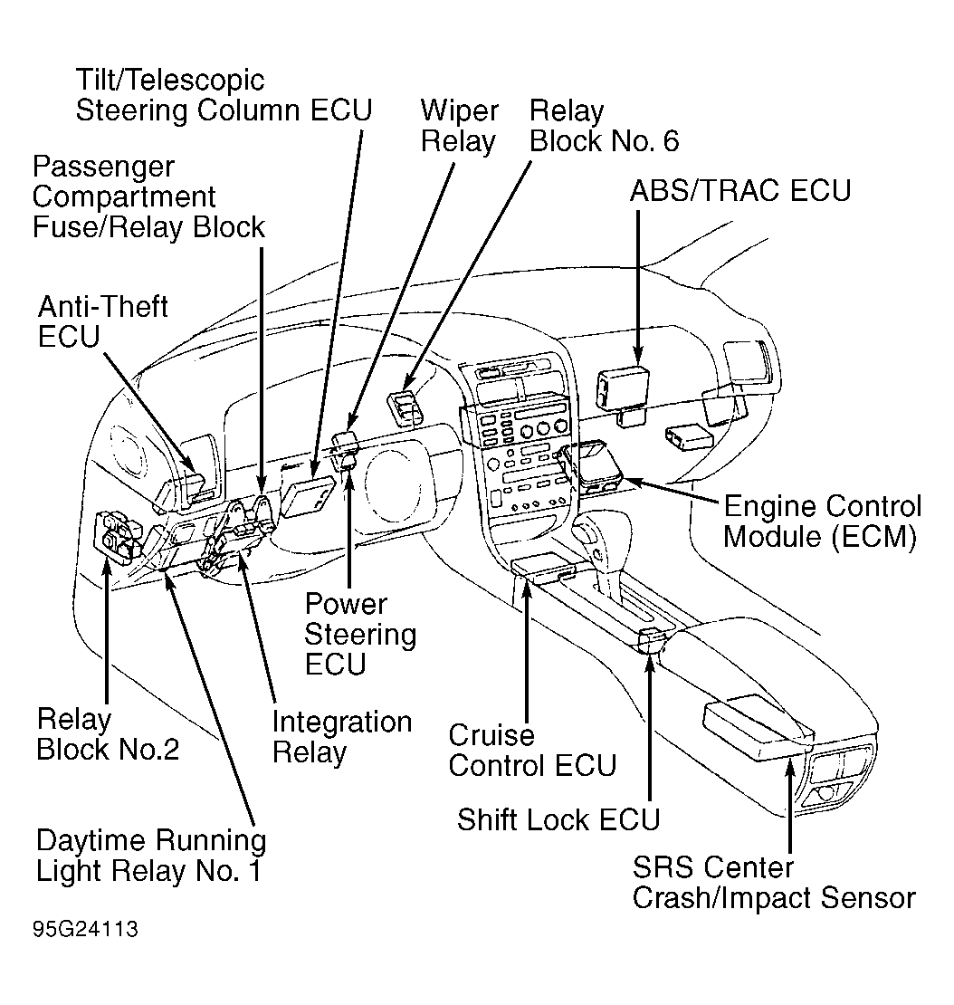 | ABS Control Unit | Behind right side of dash, integral of TRAC ECU. See Figure. |