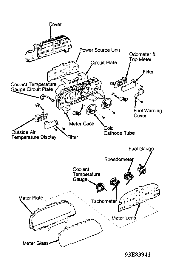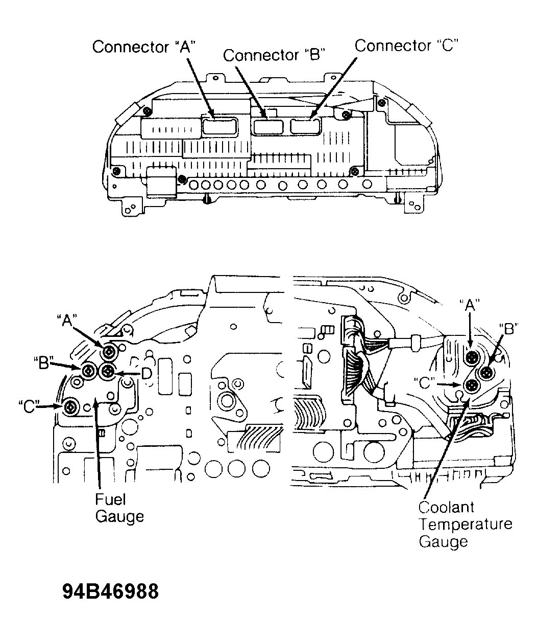 - Disconnect instrument cluster connectors "A", "B" and "C". See Figure. Start engine. Check AC voltage at terminal No. 9 of connector "B" (harness side). See Figure or Figure