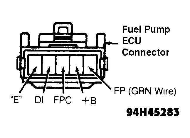 Turn ignition off. Disconnect electrical connector from fuel pump ECU. See COMPONENT LOCATIONS under INTRODUCTION. Check for continuity between chassis ground and terminals "E" and DI of fuel pump ECU connector. See Fig 1. Measure voltage between chassis ground and specified terminals of fuel pump ECU connector. See FUEL PUMP ECU CIRCUIT VOLTAGE table. If continuity and voltage are not as specified, replace fuel pump ECU.