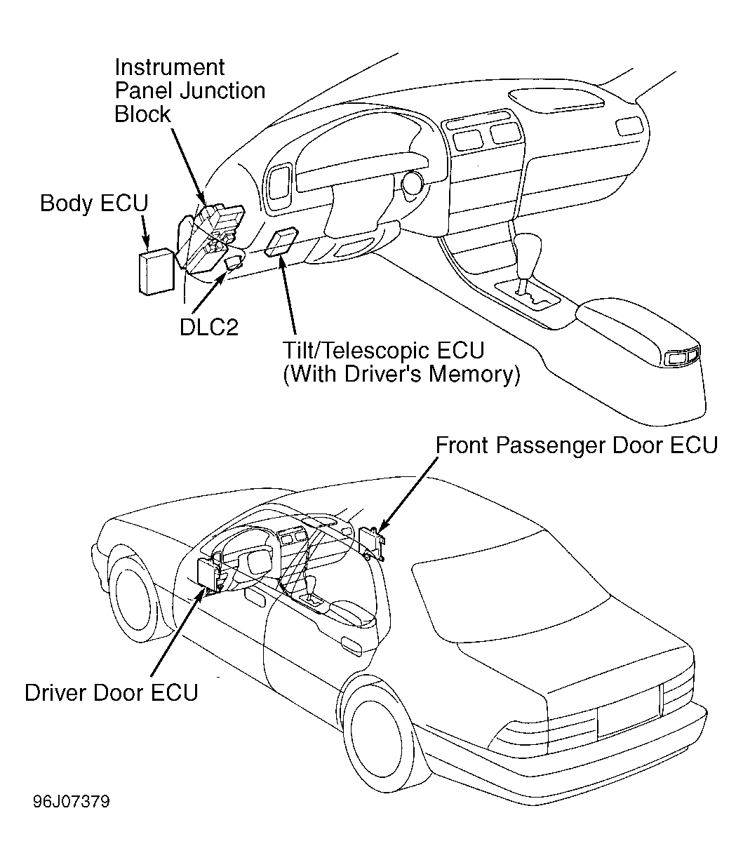 The multiplex control system consists of a body Electronic Control Unit (ECU), driver's door ECU and front passenger's door ECU. If vehicle is equipped with driver's memory system, multiplex control system also includes a tilt/telescopic ECU. See Fig 1. Multiplex control system manages the following electrical systems in the vehicle: power window control, anti-theft system, power door lock control, wiper/washer system, outside rear view mirrors, driver's memory system, auto headlight system, illumination control and various warning buzzers. The multiplex control system is also equipped with a self-diagnostic function. Some electrical systems are directly connected to the body ECU, while some electrical loads and switches are connected to the appropriate ECU.