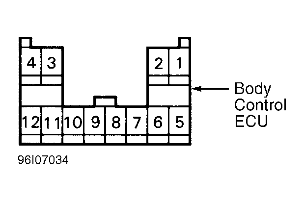 2. Remove wiring harness clamp. Lower junction block. Disconnect 12-pin connector from body control ECU, located above junction block. Place shift lever in Neutral (or depress clutch pedal). While holding ignition switch in START position, measure voltage between body ground and terminal No. 2 of body control ECU. See Fig 1.
