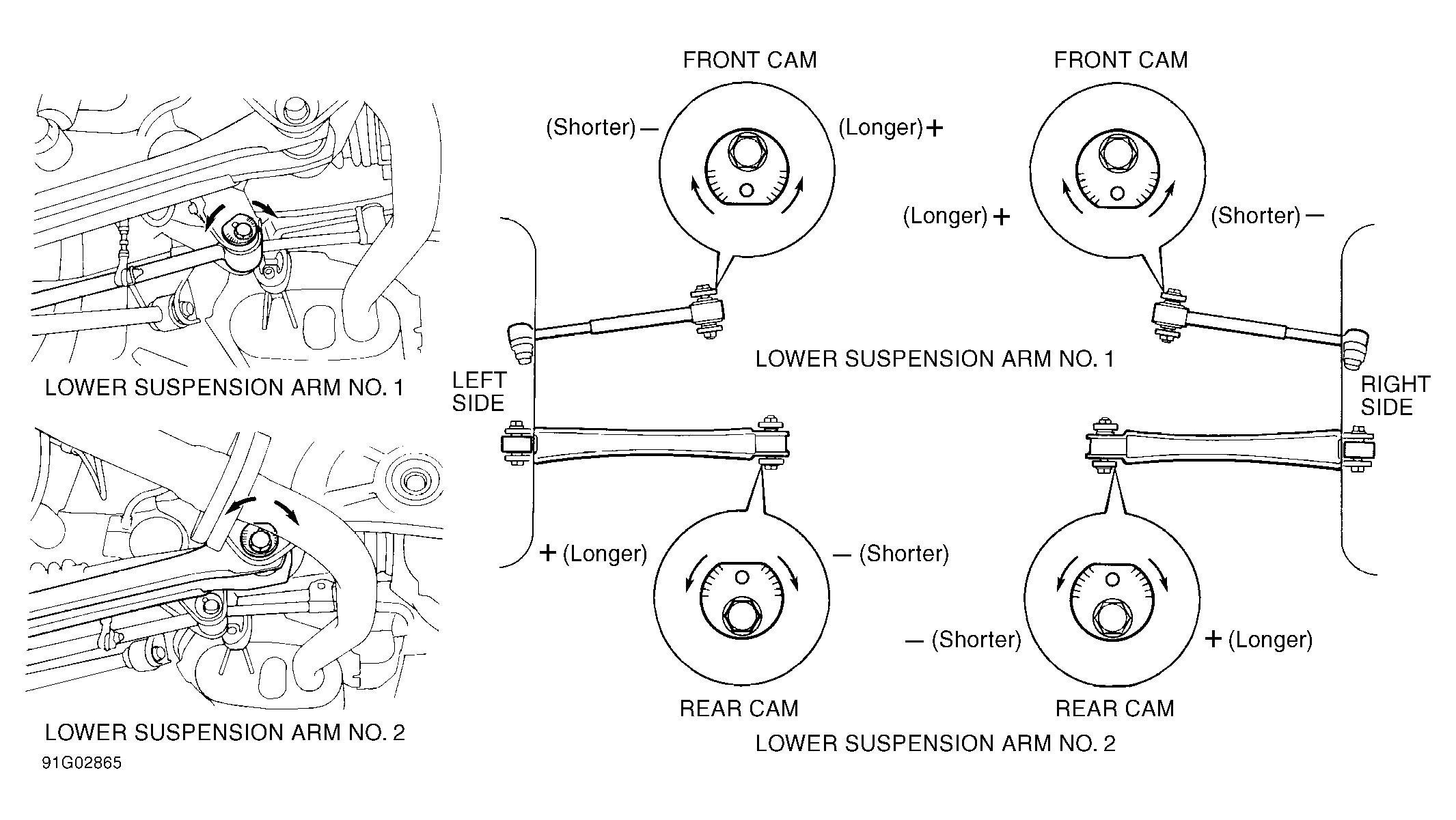 Ensure rear camber is correct. See CAMBER ADJUSTMENT under WHEEL ALIGNMENT PROCEDURES. Bounce both ends of vehicle several times to settle suspension. Measure toe-in. See WHEEL ALIGNMENT SPECIFICATIONS . If toe-in is not within specification, loosen adjuster cam bolts. Adjust toe-in by turning adjuster cams. See Figure. Tighten adjuster cam bolts to specification. See TORQUE SPECIFICATIONS .