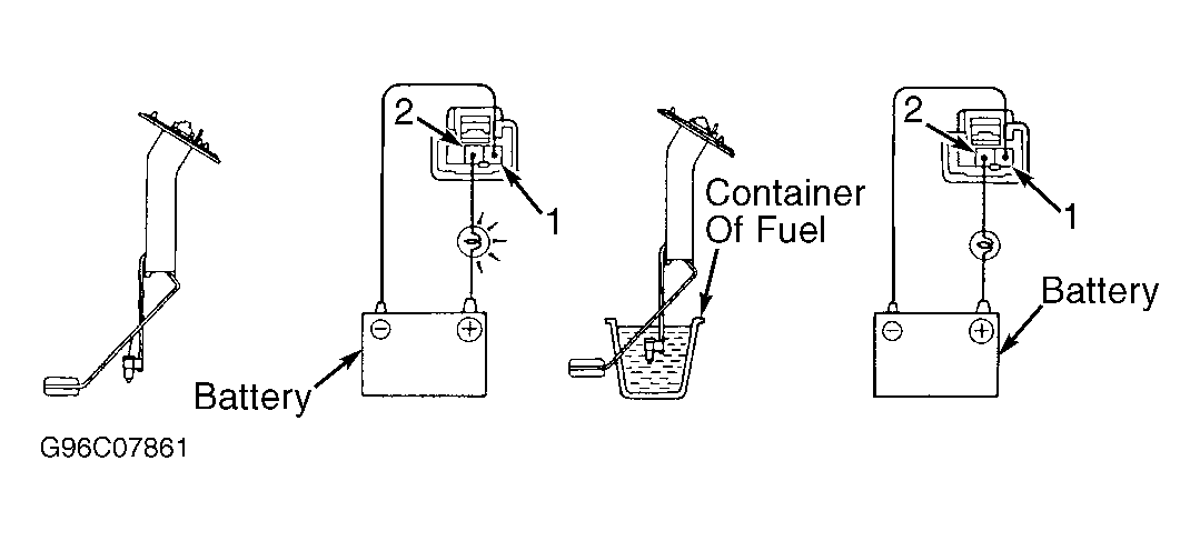 5. Connect a 3.4-watt test light between battery positive terminal and sending unit connector. Test light should come on after a few moments. Submerge entire sending unit (or fuel level sensor portion) in a container of fuel. Test light should go out. If operation is not as specified, replace sending unit.