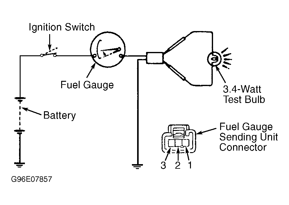 2. Connect a jumper wire between terminals No. 1 and 2 at fuel gauge sending unit connector. For fuel gauge sending unit connector identification, see Figure.