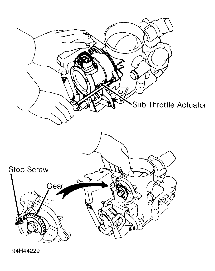 1. Disconnect sub-TP sensor connector. Loosen sub-TP sensor mounting screws. Remove sub-throttle actuator. See Fig 1. Ensure sub-throttle valve is fully closed and sub-throttle valve gear is touching stop screw. Insert feeler gauge between gear and stop screw. See SUB-TP SENSOR ADJUSTMENT  table.