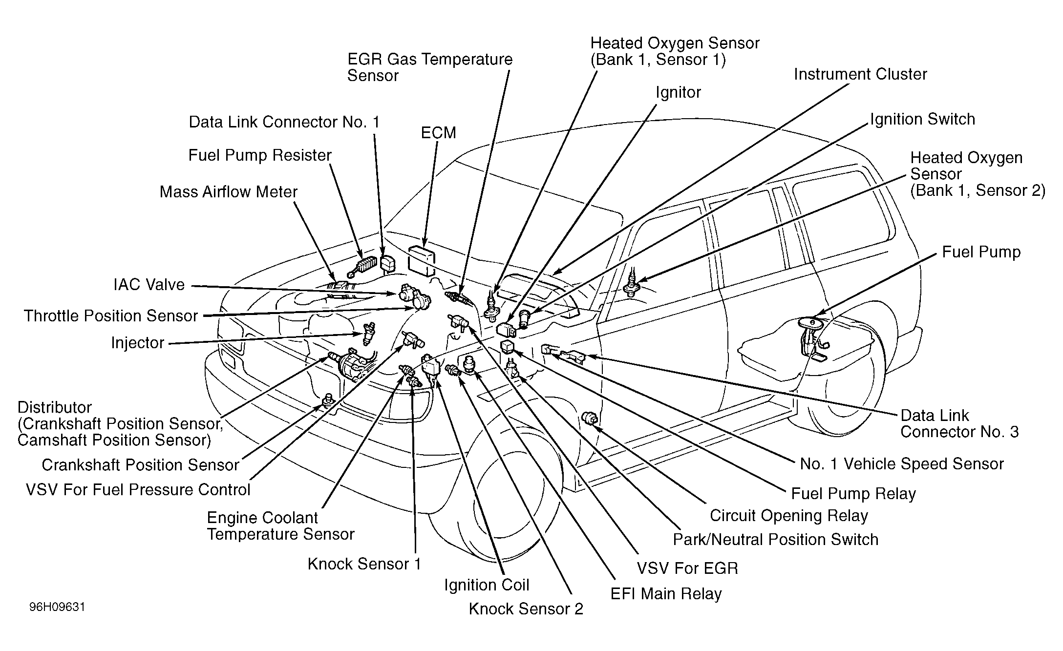 ECM controls engine operation based on input signals from various sensors. See Fig 1 ECM also controls transmission. If self-diagnostic system detects a fault, it stores a trouble code in the ECM memory, and turns on the Malfunction Indicator Light (MIL), also known as CHECK ENGINE light. For more information, see appropriate SELF-DIAGNOSTICS article.