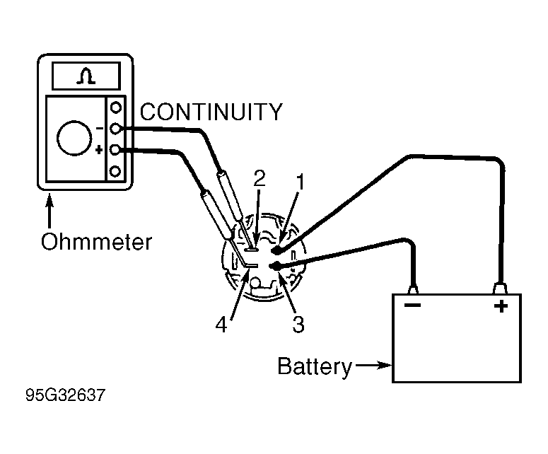- To test circuit opening relay operation, apply battery voltage and ground to relay and use ohmmeter to check continuity between specified terminals. See Fig 3. Replace circuit opening relay if defective.