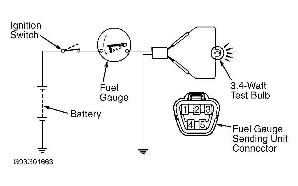 - Disconnect fuel gauge sending unit connector. Connect a jumper wire between terminals No. 1 and 3 at fuel gauge sending unit connector. For fuel gauge sending unit connector identification, see Figure.