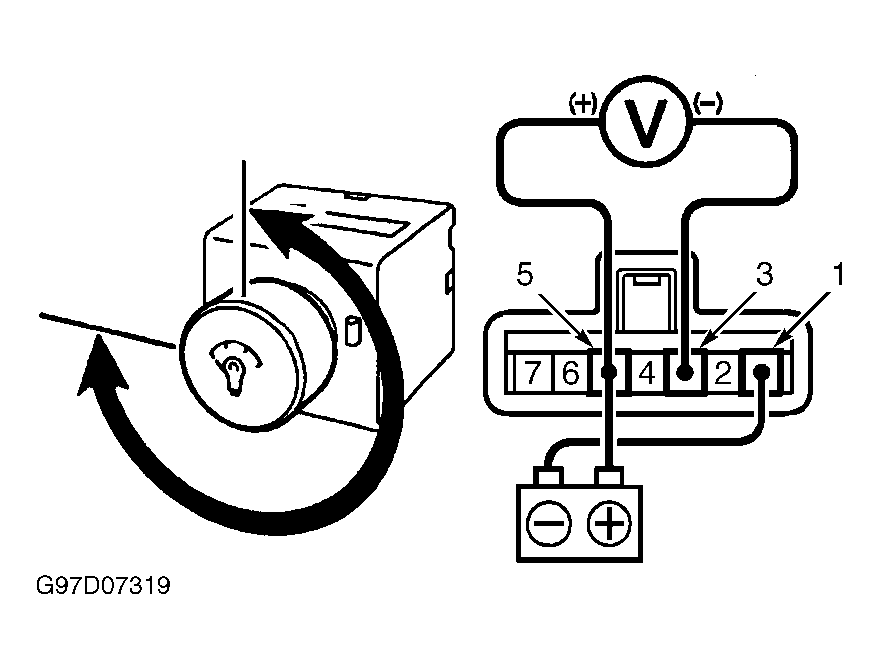 - Connect battery positive to terminal No. 5 and No. 7. Connect terminal No. 1 to ground. Check voltage between terminal No. 7 (+) and terminal No. 2 (-). Turn rheostat. Voltage should change.