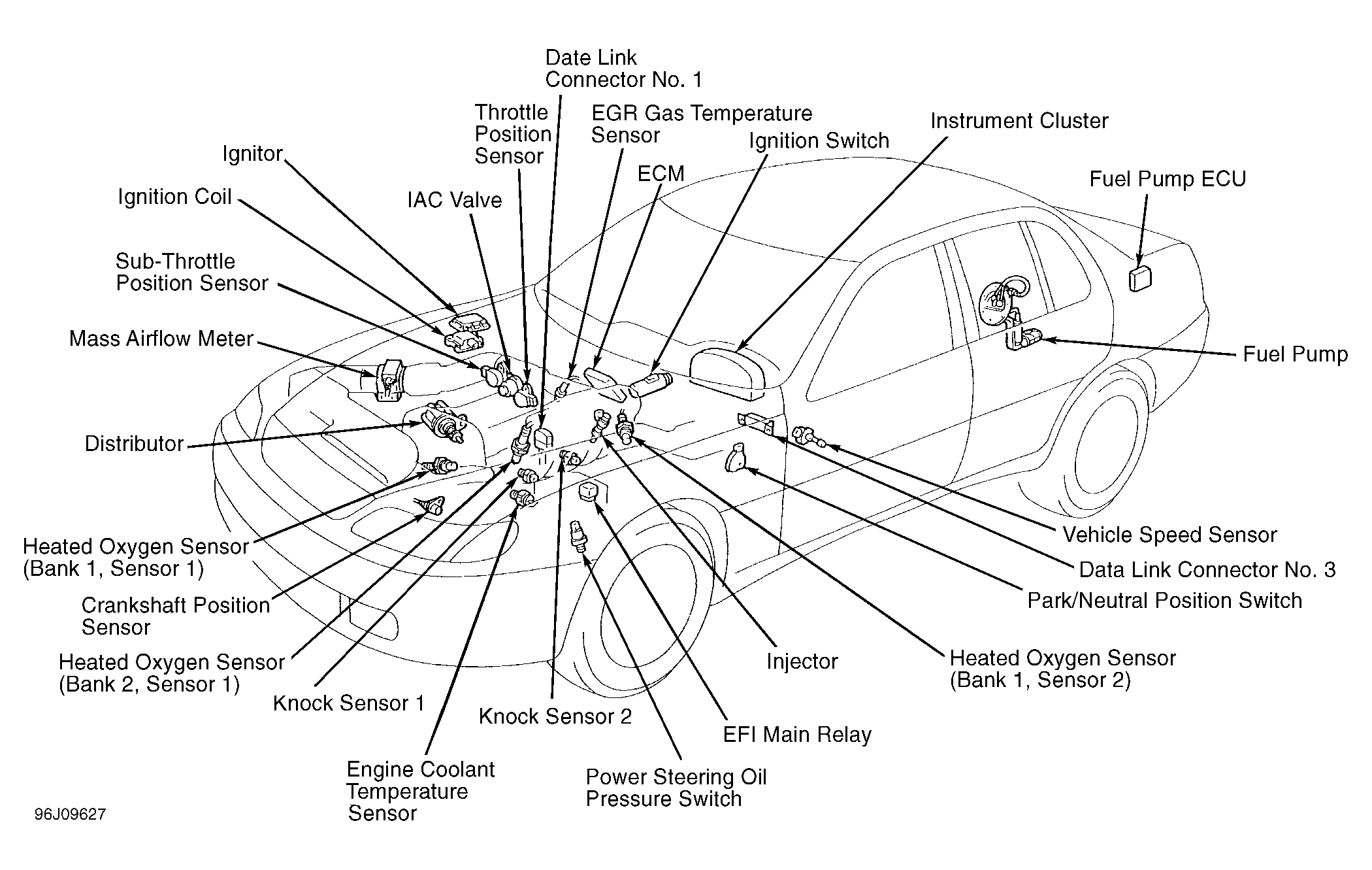 ECM controls engine operation based on input signals from various sensors. See Fig 1. ECM also controls transmission. If self-diagnostic system detects a fault, it stores a trouble code in the ECM memory, and turns on the Malfunction Indicator Light (MIL), also known as CHECK ENGINE light. For more information, see appropriate TESTS W/CODES article.