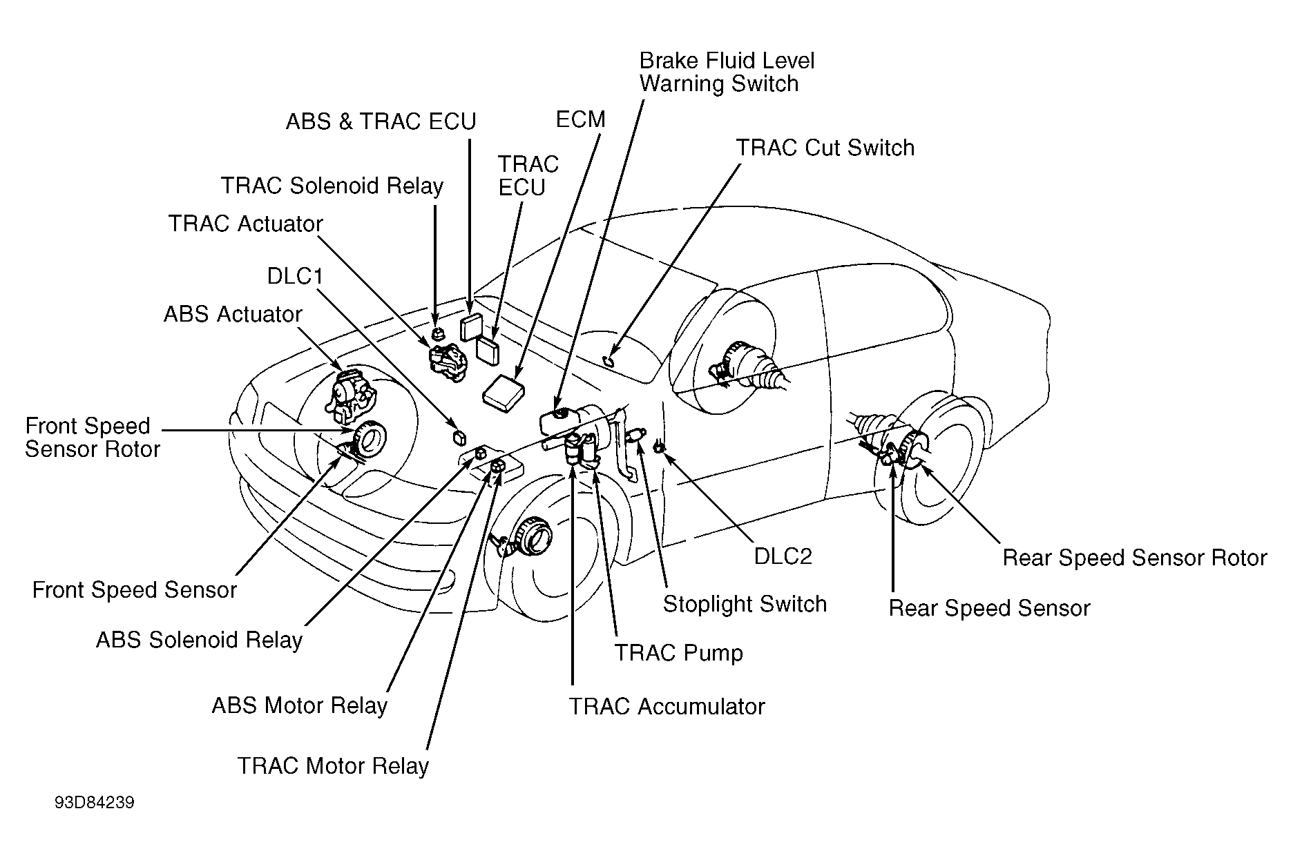 Anti-Lock Brake System (ABS) controls brake fluid pressures to each individual front and rear brake calipers during a panic stop to prevent wheel lock-up. System consists of actuator, solenoid relay, pump motor relay, Electronic Control Unit (ECU), and a speed sensor at each wheel. If a system fault occurs, the ECU stores a self-diagnostic code(s) that can be retrieved to diagnose malfunction. See Fig 1. Some models are equipped with an optional Traction Control (TRAC) system, which is integrated with the ABS system.