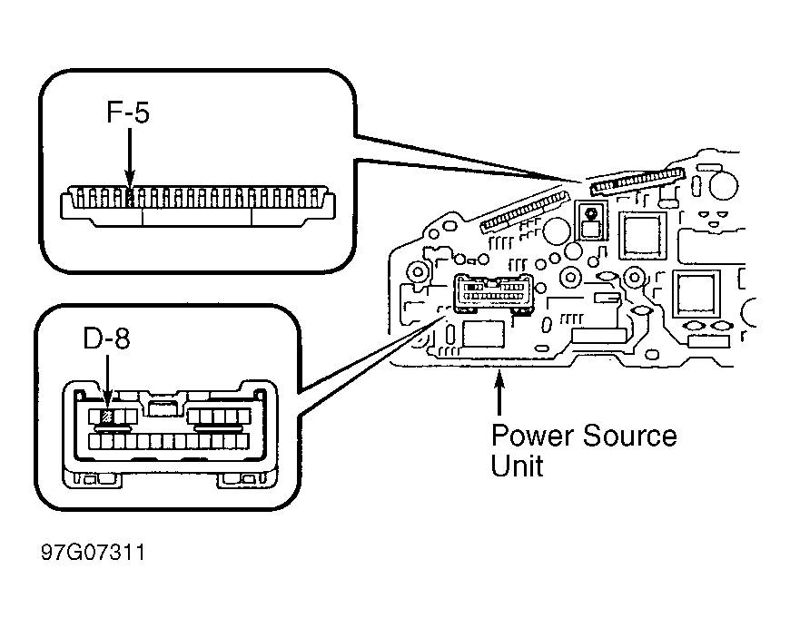 - Disconnect all instrument panel connectors. Check resistance between D8 and F5. See Fig 3. If resistance is 6300-6800 ohms, replace speedometer. If resistance is not 6300-6800 ohms, replace power source unit.