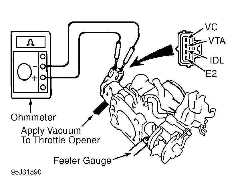 - Apply vacuum to throttle opener. Insert specified thickness feeler gauge between throttle stop screw and throttle lever, and check resistance or continuity. See TP SENSOR RESISTANCE SPECIFICATIONS table. Replace or adjust TP sensor if not within specification.