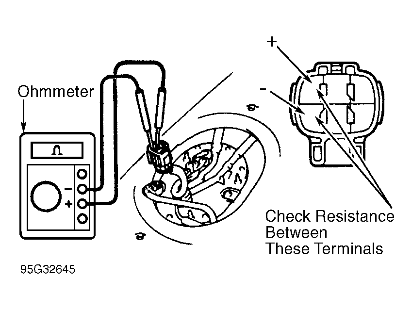 - To test fuel pump resistance, use ohmmeter to check resistance between specified terminals on electrical connector for fuel pump. See Fig 1. Replace fuel pump if resistance is not .20-3.00 ohms at 68°F (20°C).CAUTION: When testing fuel pump operation, DO NOT apply battery voltage to fuel pump for more than 10 seconds, or fuel pump may be damaged. When testing fuel pump operation, keep fuel pump away from battery as far as possible.