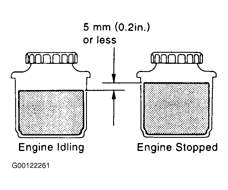 - With the engine idling, measure the fluid level in the oil reservoir.Stop the engine. Check fluid level rise. Wait a few minutes and remeasure the fluid level in the reservoir. Maximum fluid rise should be 0.2" (5 mm). See Fig 1. If a problem is found, bleed power steering system.