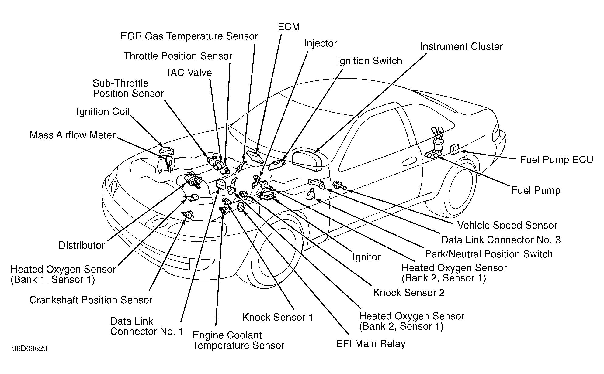 ECM controls engine operation based on input signals from various sensors. See Fig 1. ECM also controls transmission. If self-diagnostic system detects a fault, it stores a trouble code in the ECM memory, and turns on the Malfunction Indicator Light (MIL), also known as CHECK ENGINE light. For more information, see appropriate TESTS W/CODES article.