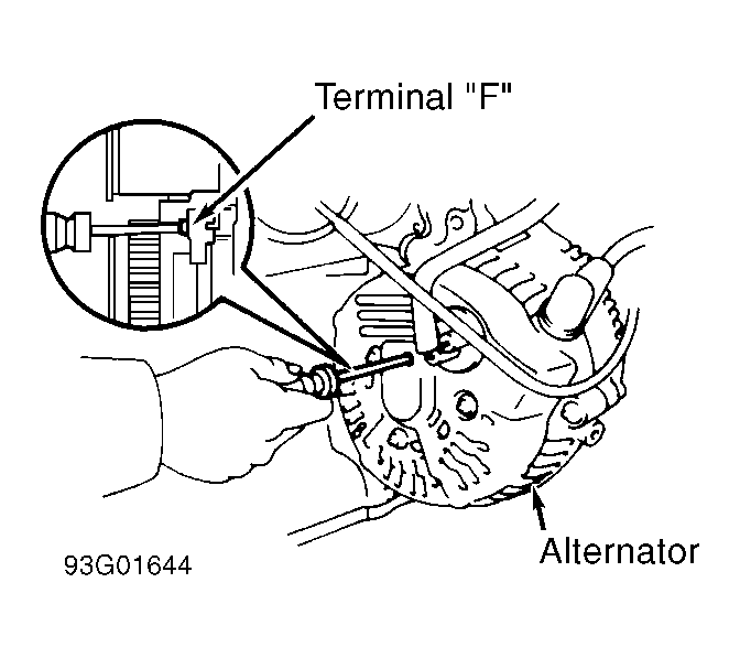 - If output voltage is low, by-pass regulator (full field generator) by grounding terminal "F" at back of generator. See Fig 1. Recheck charging system output voltage. If voltage now exceeds output voltage specified in GENERATOR OUTPUT SPECIFICATIONS table, replace regulator and recheck. If output voltage is still incorrect, repair or replace generator.