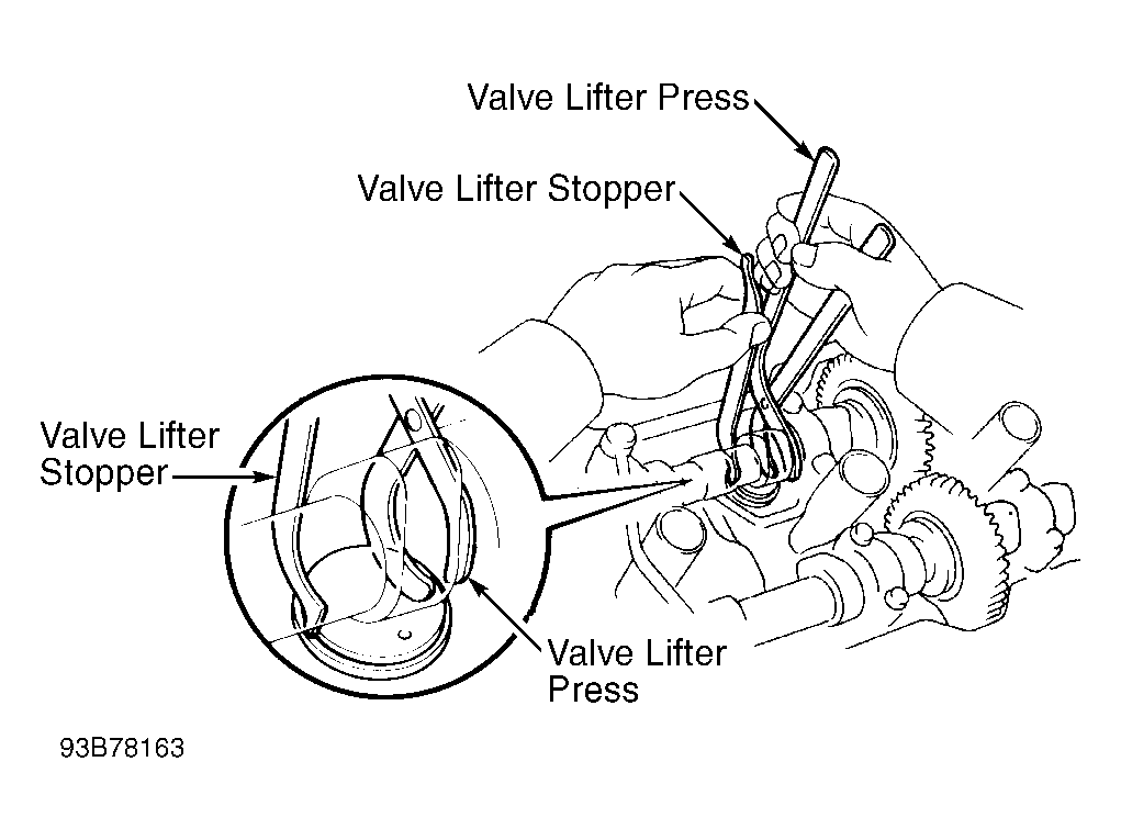 - Place shim onto valve lifter with imprinted numbers facing down. Press downward on valve lifter using valve lifter press, and remove valve lifter stopper. Recheck valve clearance to ensure it is correct.