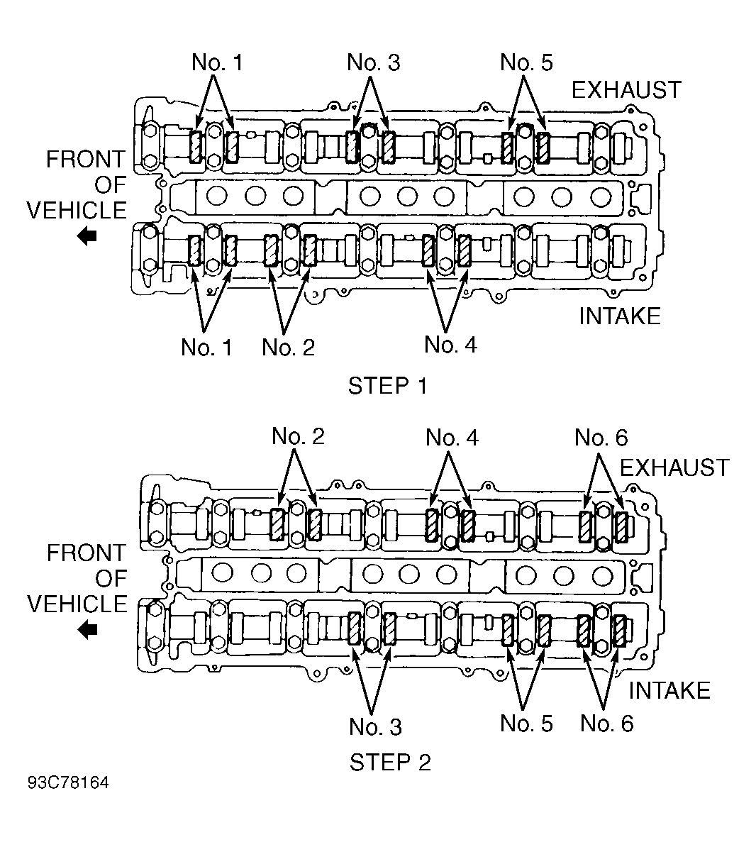 - Measure and record clearance of intake valves for cylinders No. 1, 2 and 4, and exhaust valves for cylinders No. 1, 3 and 5. See Fig 2. Rotate crankshaft 360 degrees. Measure and record clearance of intake valves for cylinders No. 3, 5 and 6, and exhaust valves for cylinders No. 2, 4 and 6.