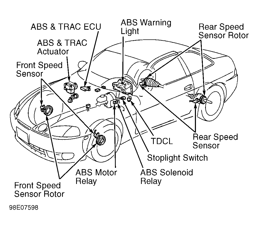 Anti-Lock Brake System (ABS) controls brake fluid pressures to each individual front and rear brake caliper during a panic stop to prevent wheel lock-up. System consists of actuator, solenoid relay, pump motor relay, Electronic Control Unit (ECU), and a speed sensor at each wheel. If a system fault occurs, the ECU stores a self-diagnostic code(s) that can be retrieved to diagnose malfunction. Some models are equipped with an optional Traction Control (TRAC) system, which is integrated with the ABS system. See Fig 1 or Fig 2 .