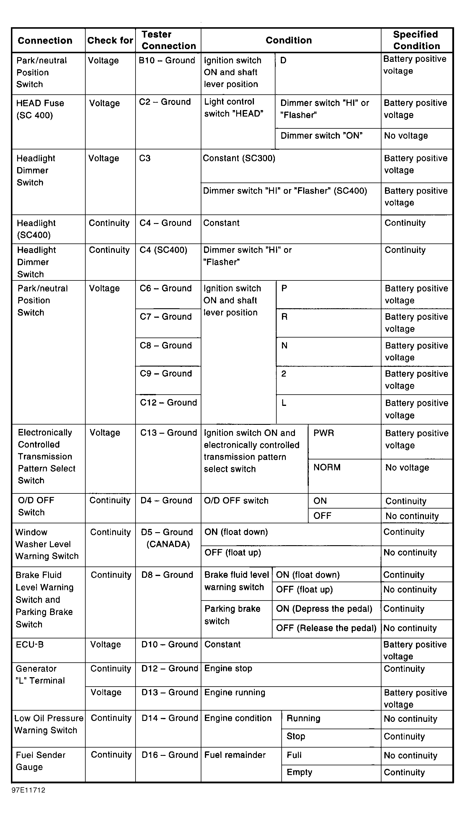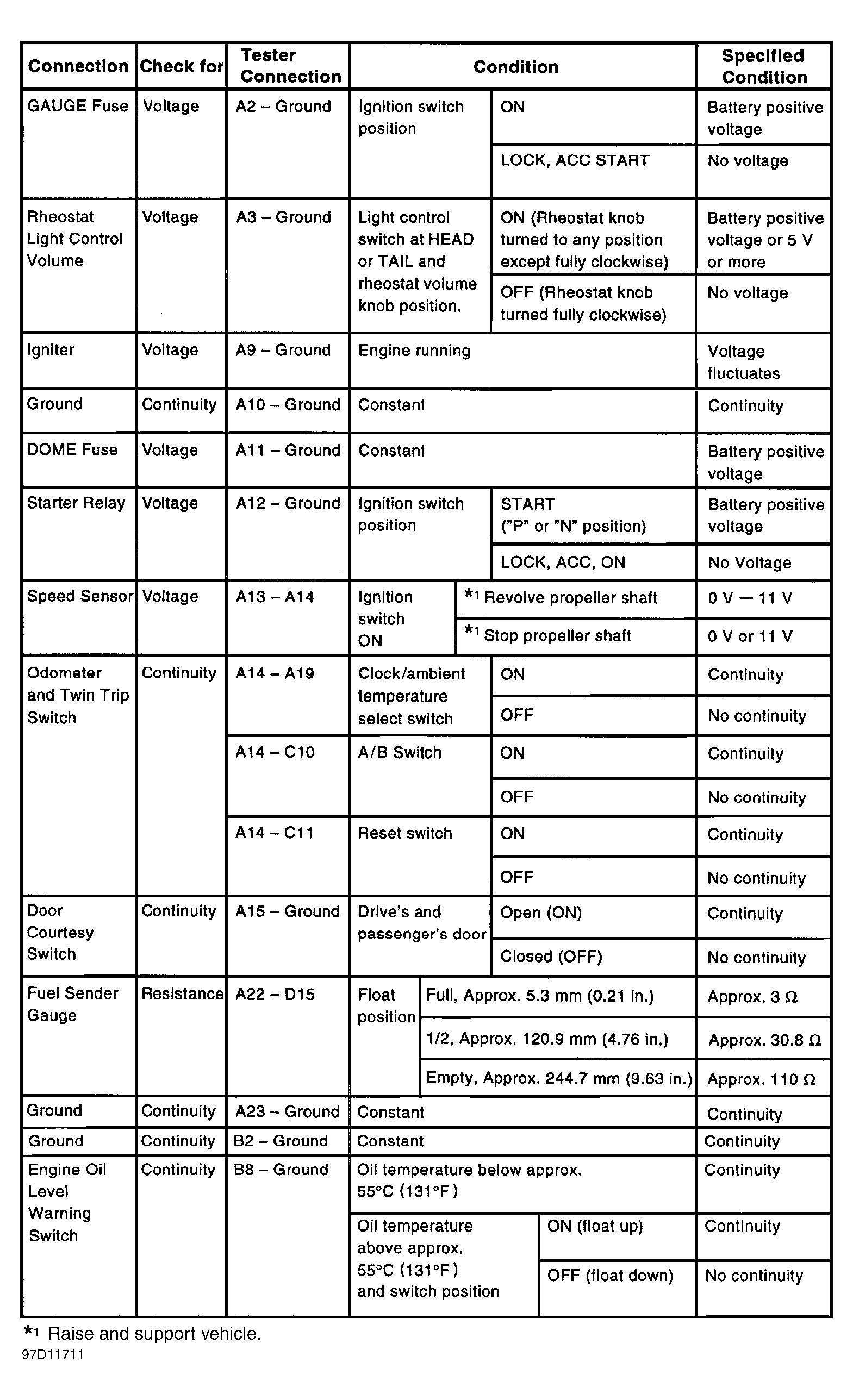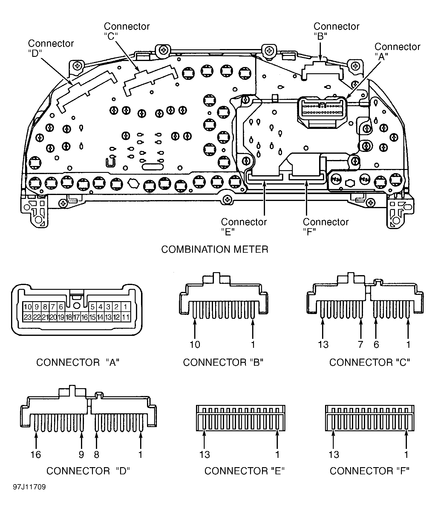 Disconnect instrument cluster connectors "A", "B" and "D". See Fig 1. Using DVOM, test each circuit from the harness side of appropriate connector under the condition listed. See Fig 2- Fig 3 . If specification value is not as specified, repair wiring as necessary. See appropriate wiring diagram in WIRING DIAGRAMS .