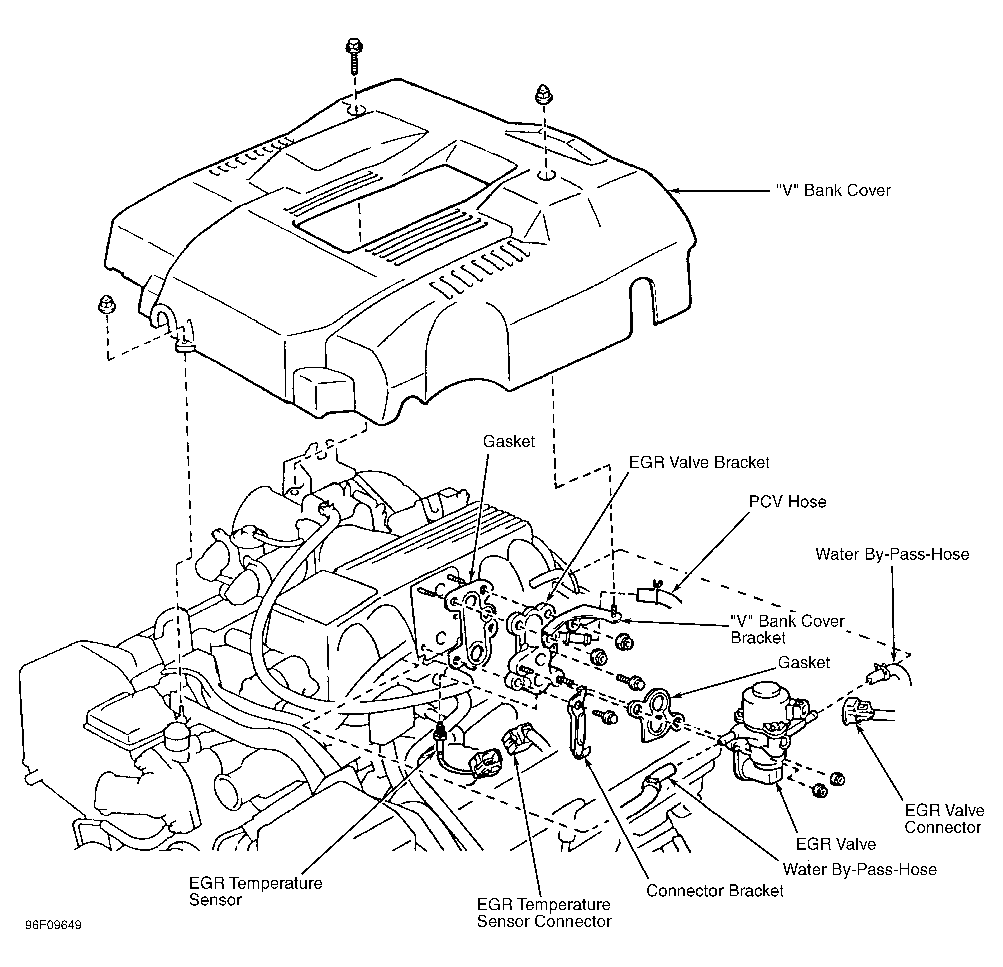 - Remove "V" bank cover. See Figure. To remove left distributor, go to step 4). To remove right distributor, disconnect Idle Air Control (IAC) valve air hoses from No. 3 timing belt cover. See Figure.
