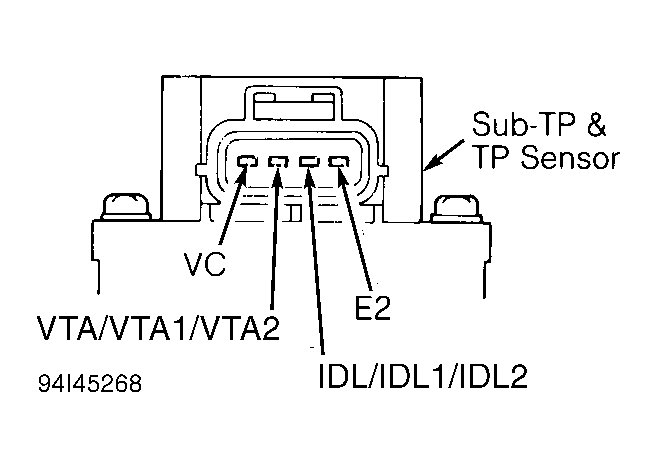 Disconnect sub-TP sensor connector. See Fig 1. Measure resistance between sub-TP sensor terminals. See SUB-TP SENSOR RESISTANCE table. See Fig 2. If resistance is not as specified, adjust sub-TP sensor. See SUB-THROTTLE POSITION (SUB-TP) SENSOR in ADJUSTMENTS article. Recheck resistance. If resistance is still not as specified, replace sub-TP sensor.