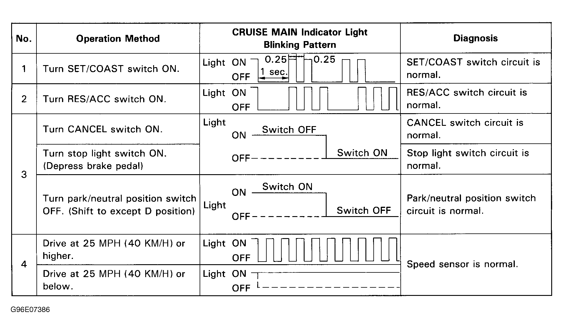 Operate appropriate switch (or simulate driving if checking speed sensor). See Figure. If cruise indicator light does not respond as specified, cruise control ECU is not receiving input signal due to a faulty circuit.