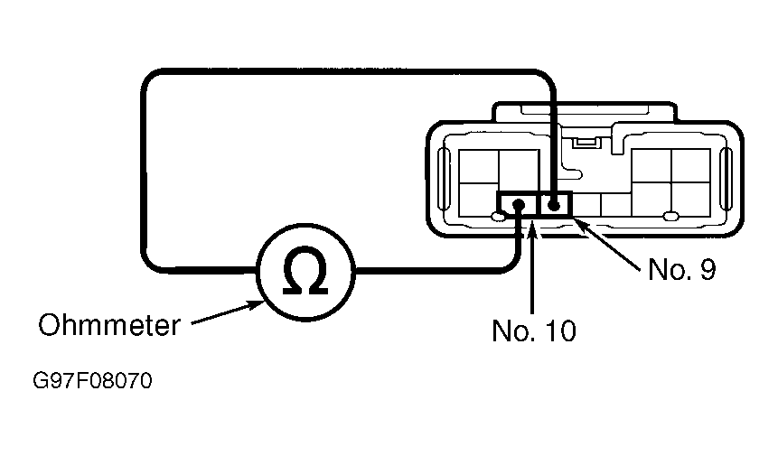 - Disconnect key unlock warning switch connector. Measure resistance between key unlock warning switch connector terminals No. 9 and No. 10. See Fig 1. Resistance should be more than 1 megaohm with key removed from ignition switch. Continuity should exist with key inserted in ignition. If resistance is as specified, go to next step. If resistance is not as specified, replace key unlock warning switch and retest system.