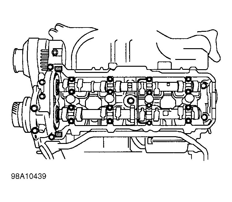 6. Remove timing belt from camshaft timing pulleys. See appropriate article in the ENGINES section. Remove camshafts for appropriate bank and valve. See appropriate article in the ENGINES section.