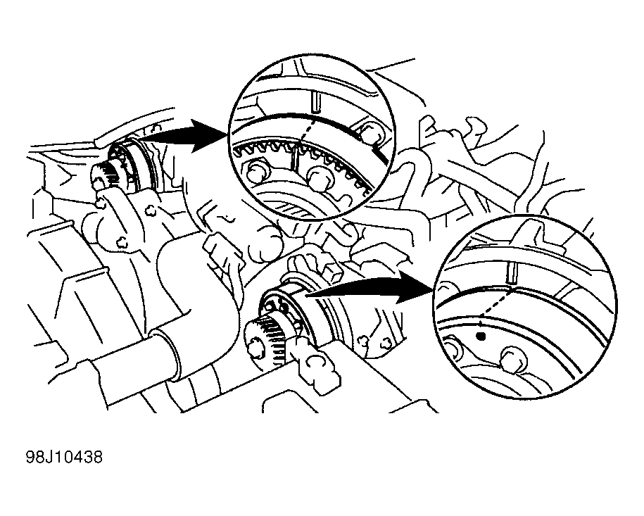 3. Rotate crankshaft clockwise until piston No. 1 is at TDC of compression stroke. Ensure groove on crankshaft pulley aligns with "0" timing mark on timing belt cover. Timing marks on camshaft pulleys should align with timing marks on timing belt cover No. 4 (upper inner cover). See Figure. If timing marks do not align rotate crankshaft clockwise 360 degrees.