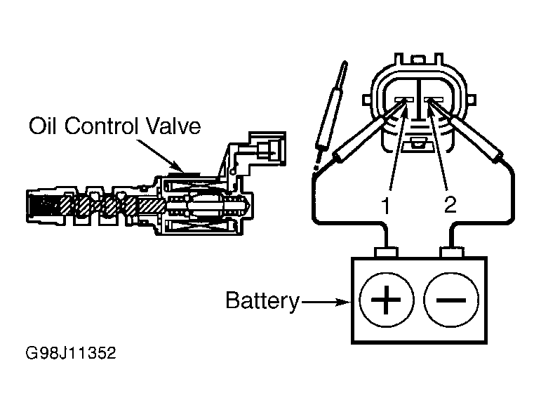 1. Start and run engine. Allow engine to reach normal operating temperature. Disconnect suspect Oil Control Valve (OCV) connector. Connect fused jumper wires between positive battery terminal and suspect OCV connector terminal No. 1, and negative battery terminal and OCV connector terminal No. 2. See Figure.